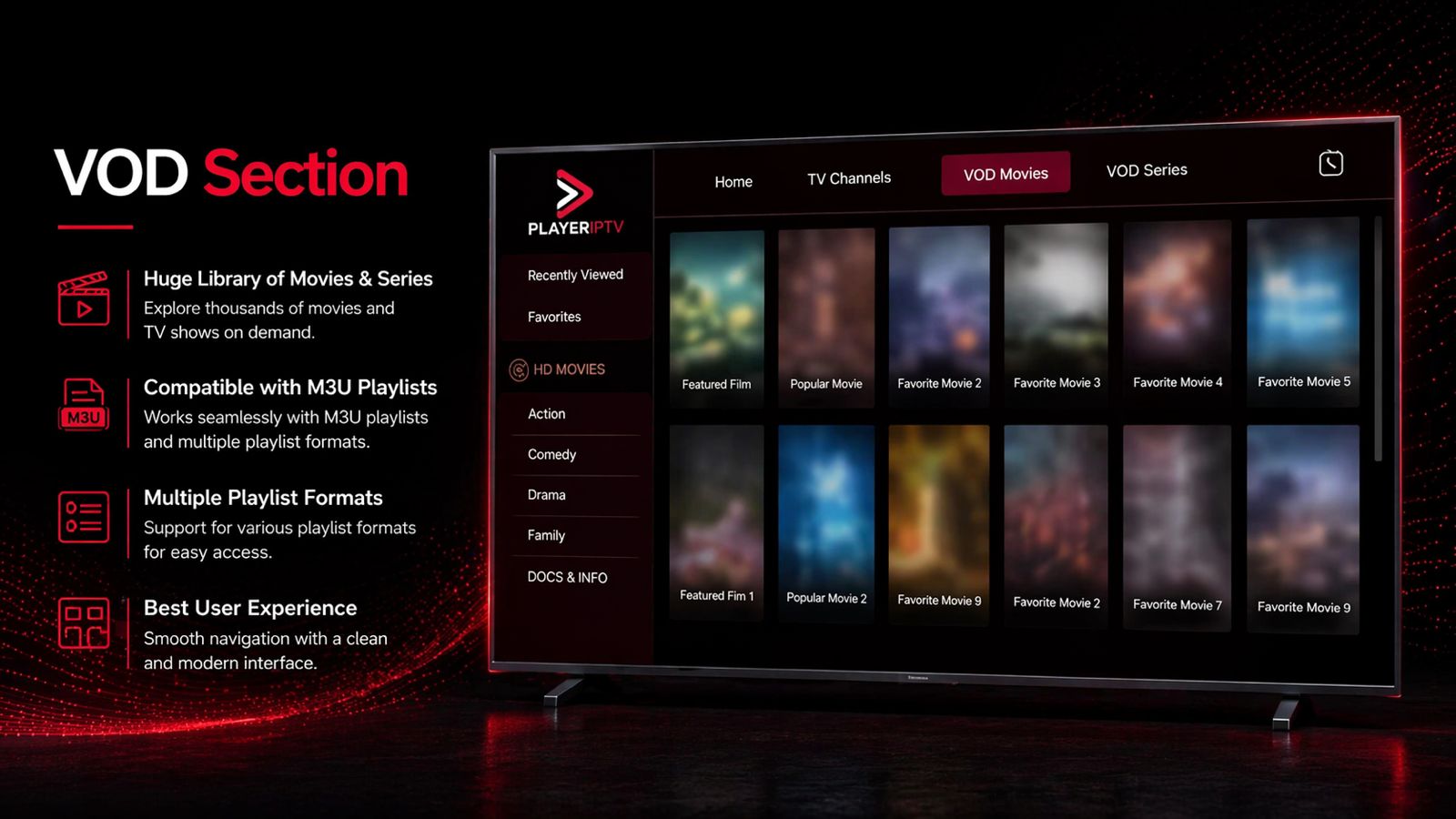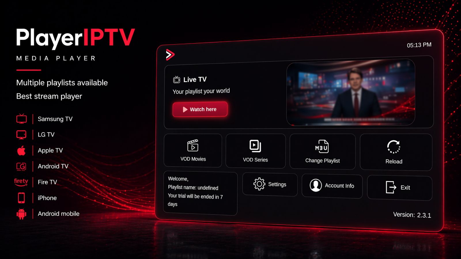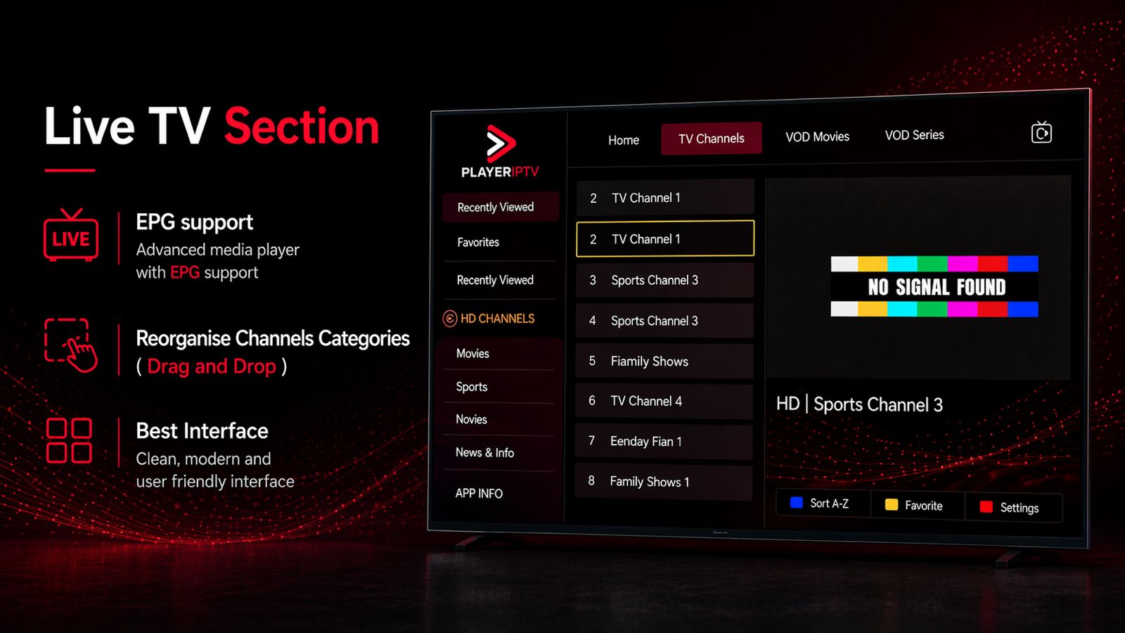 Player IPTV with simple UI Design, Player IPTV is available in Samsung TV , LG TV , tvOS, iOS, Android TV, Fire TV . Player IPTV 7 Days free Trial and need to upload YOUR own playlists to use it!